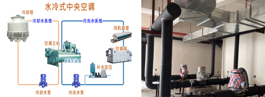 冷卻水循環(huán)系統(tǒng):這一部分的系統(tǒng)主要是由冷卻泵、冷卻管道、冷卻水塔及冷凝器等組成。該熱能通過(guò)主機(jī)內(nèi)的冷媒傳遞給冷卻水,使冷卻水溫度升高。冷卻泵將升溫后的冷卻水壓入冷卻水塔(出水),使之與大氣進(jìn)行熱交換,降低溫度后再送回主機(jī)冷凝器(回水)。